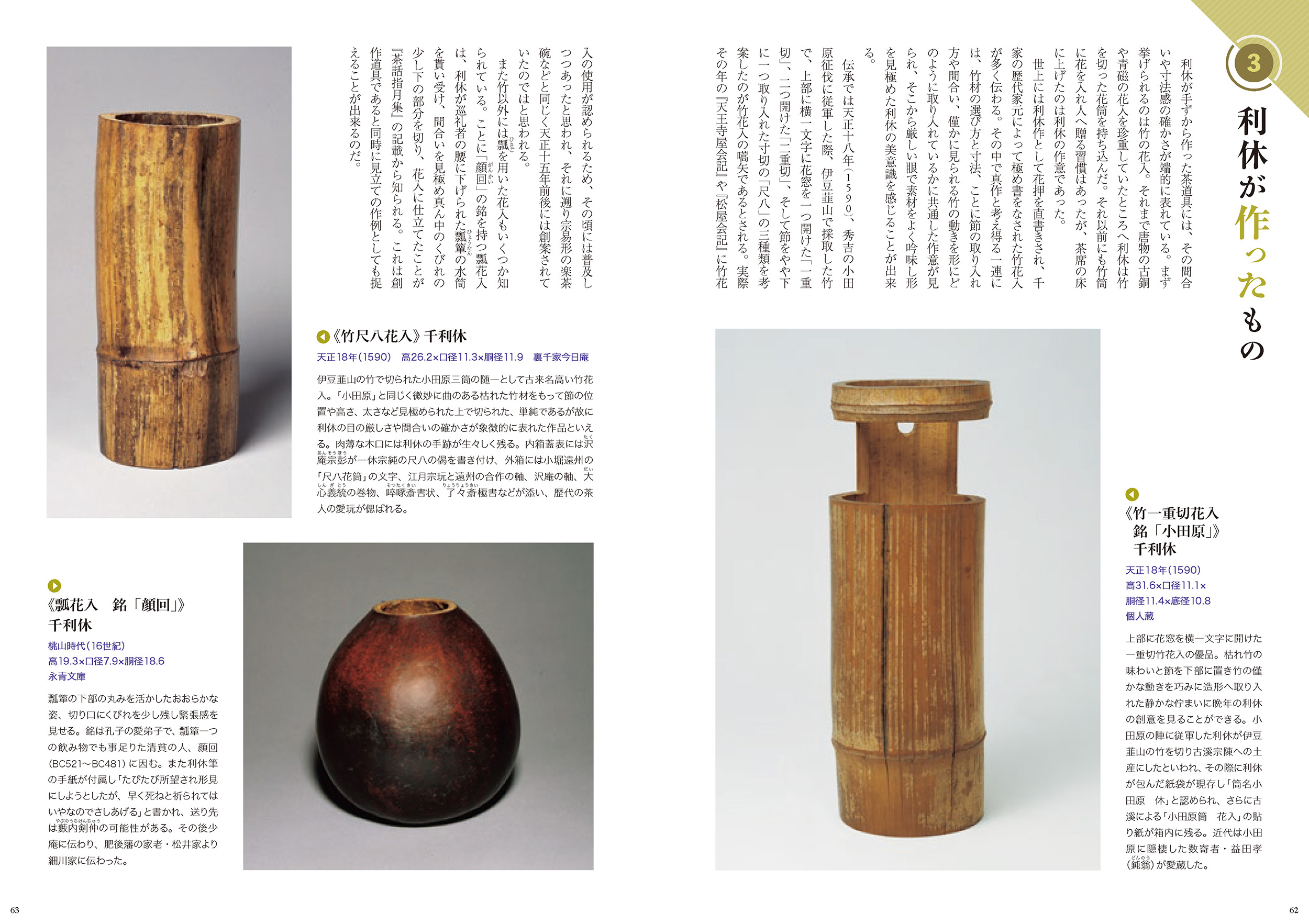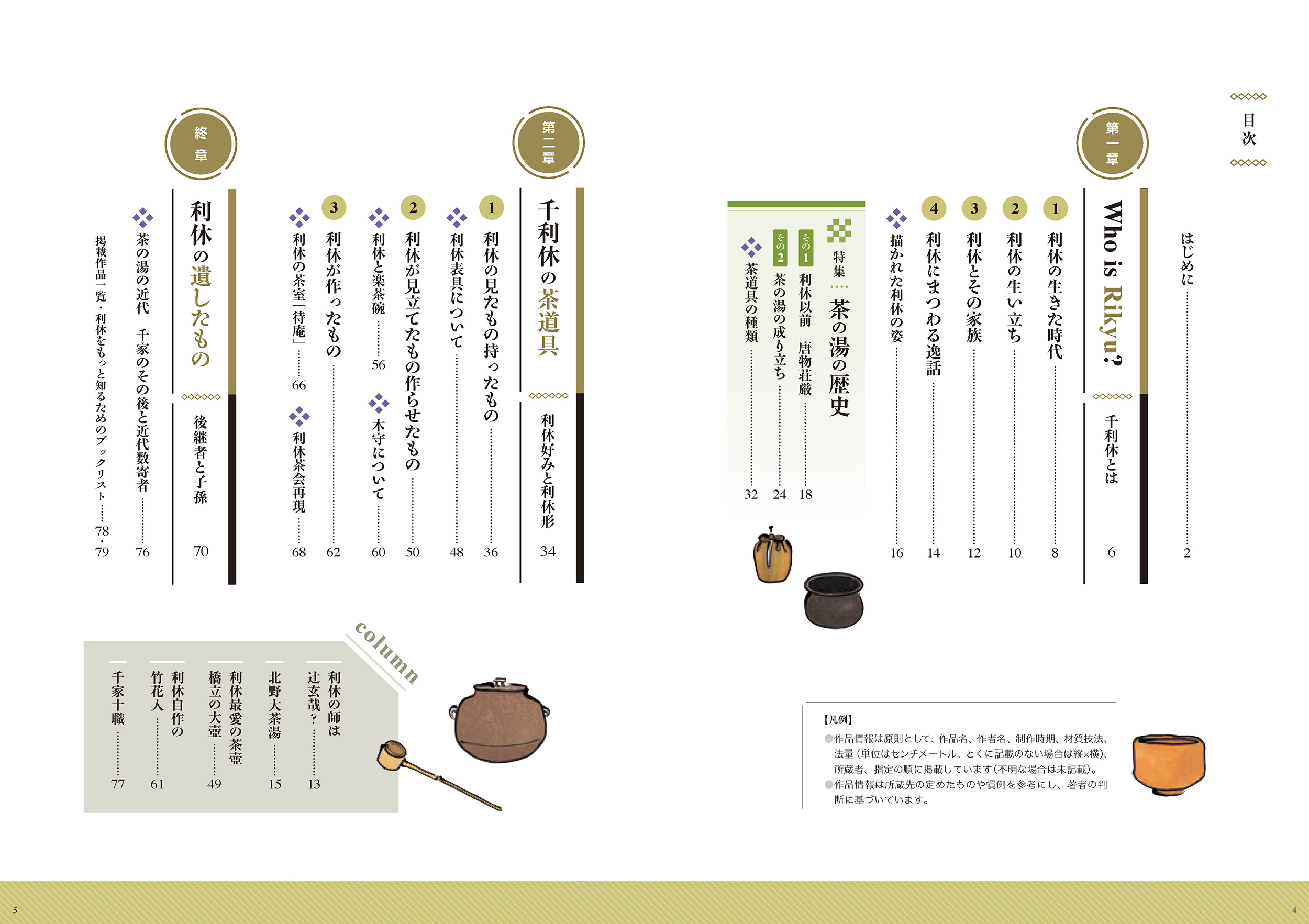 1.Who is Rikyu?―千利休とは 2.千利休の茶道具―利休好みと利休形 3.利休の遺したもの―後継者と子孫 特集:茶の湯の歴史