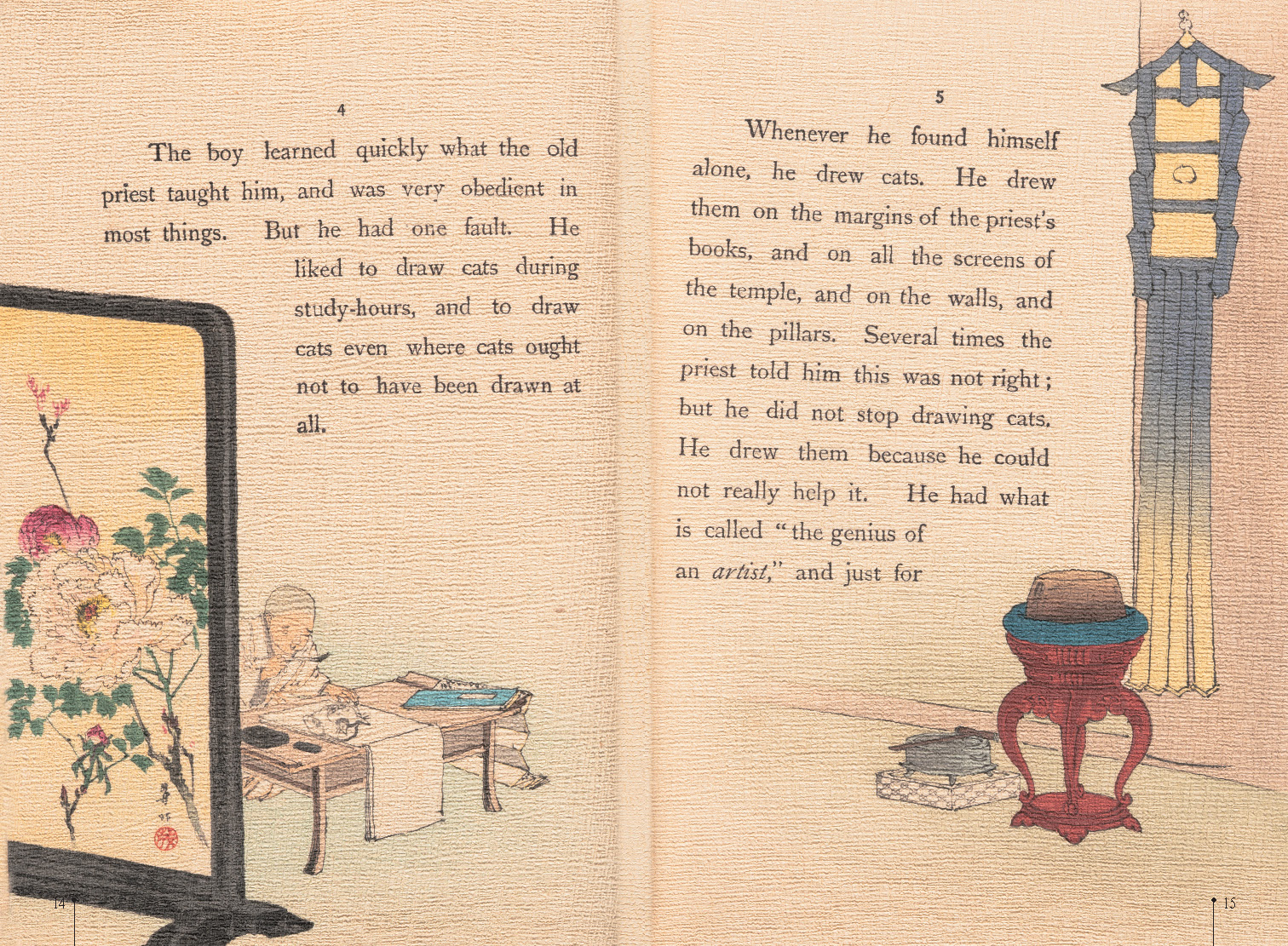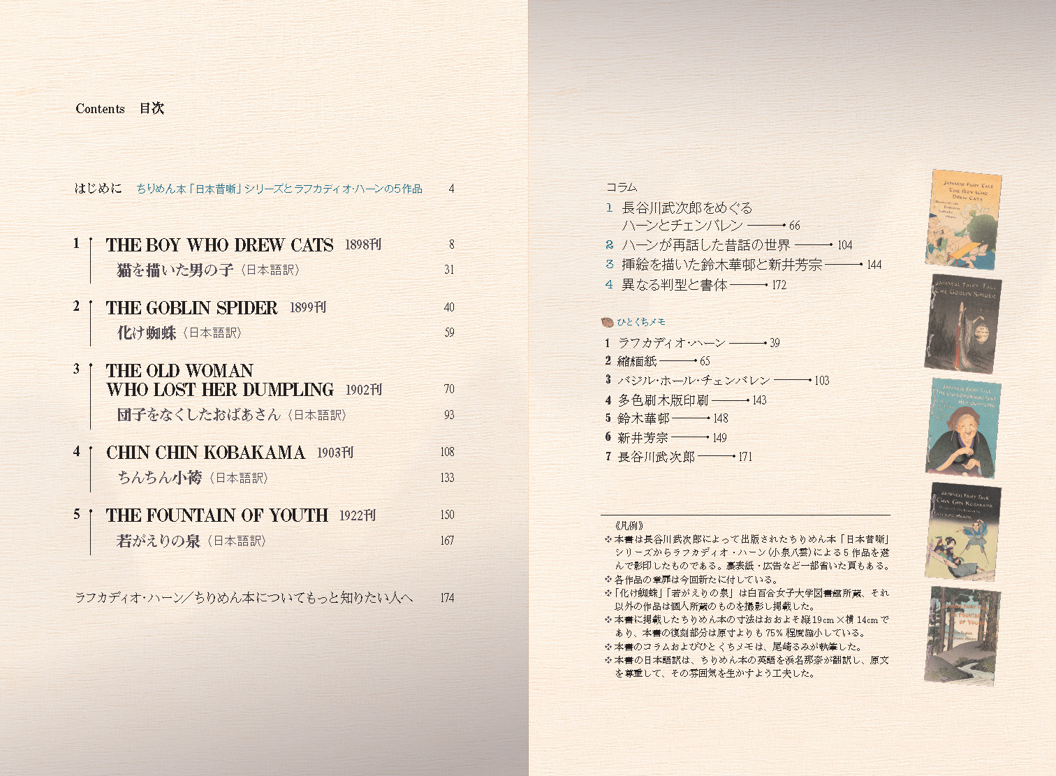 小泉八雲の絵入り本が復活。明治時代の美しい「ちりめん本」から八雲作品を当時の誌面のままに1冊にまとめた。「猫を描いた男の子」「化け蜘蛛」「ちんちん小袴」ほか5話を収録。制作秘話等のコラム・日本語訳付
